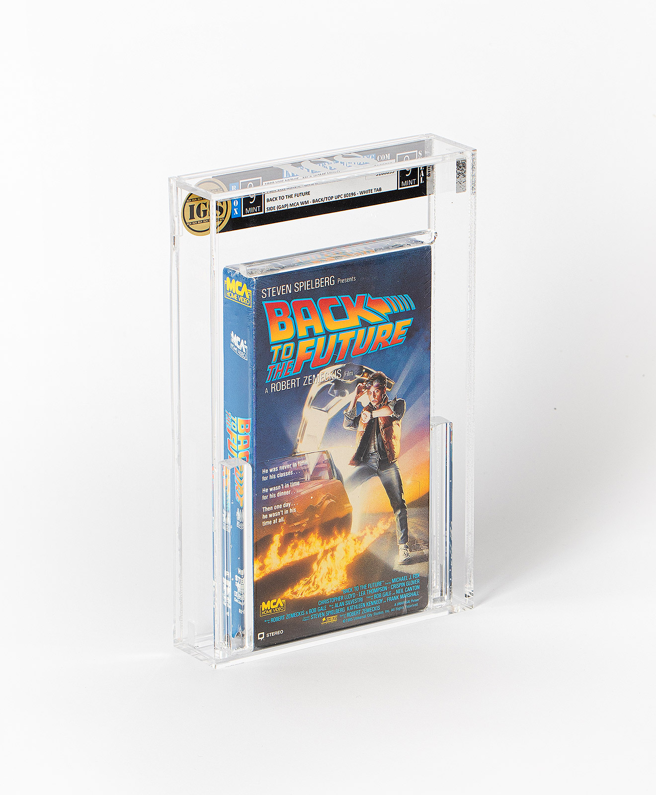 Encapsulated and graded MINT 9.0 with a seal rating of MINT 9.0 by IGS. This is a sealed and graded 1989 copy of “Back to The Future” on VHS. The Robert Zemeckis directed film starring Michael J. Fox as Marty McFly and Christopher Lloyd as Doctor Brown is considered one of the best films of the 1980s, and the time-traveling comedy earned $388.8 million at the box office. In 2022, a first release sealed copy sold for $108,000.00 AUD at a Heritage auction of the now antiquated video-playing format, and was the highest price ever paid at auction for a sealed, graded VHS tape.